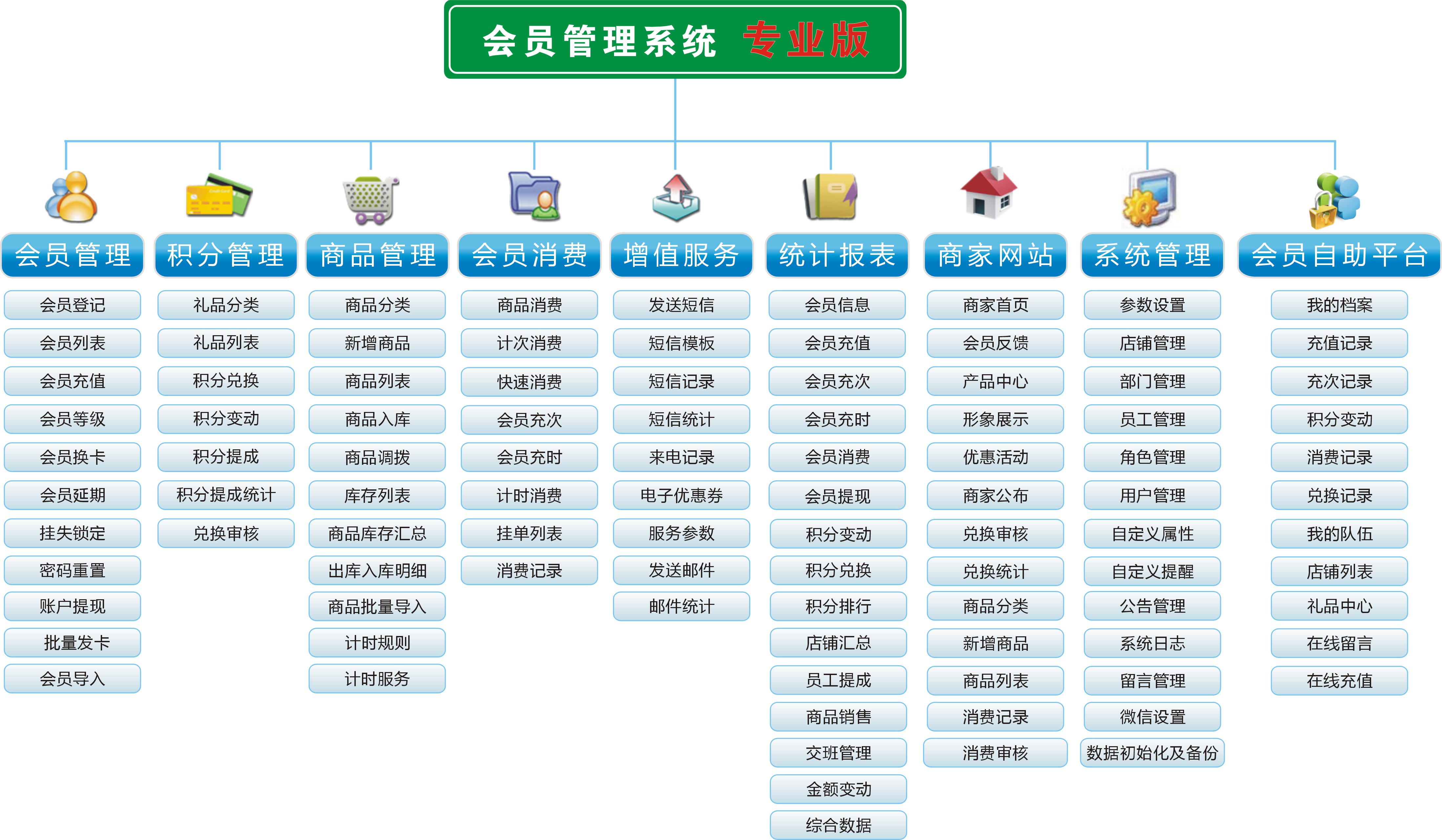 會員管理、積分管理、商品管理、會員消費、增值服務(wù)、統(tǒng)計報表、商家網(wǎng)站、系統(tǒng)管理等大模塊 可以對分店管理及各種消費數(shù)據(jù)分析!其適用于醫(yī)藥連鎖,美容美發(fā)連鎖店、超市連鎖店、服裝店連鎖店、母嬰店連鎖店、健身房連鎖店、
