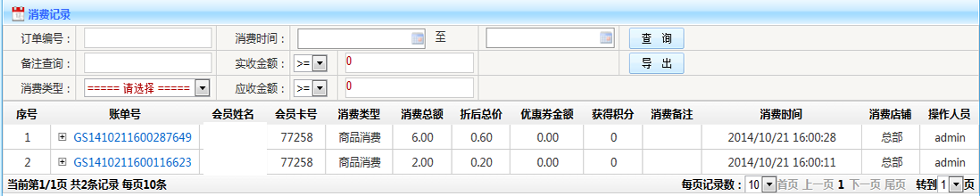 消費(fèi)記錄: 1.查詢:可以根據(jù)消費(fèi)單號(hào) 時(shí)間段 消費(fèi)類型等條件查詢 2.導(dǎo)出:可以將按條件查詢出來的數(shù)據(jù),以Excel表格形式導(dǎo)出 3.列表:雙擊訂單號(hào),如果有消費(fèi)詳情的可以查看消費(fèi)詳情