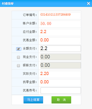 點擊結(jié)算圖標(biāo),將彈出付費找零對話框,點擊馬上結(jié)算可完成此掛單消費: