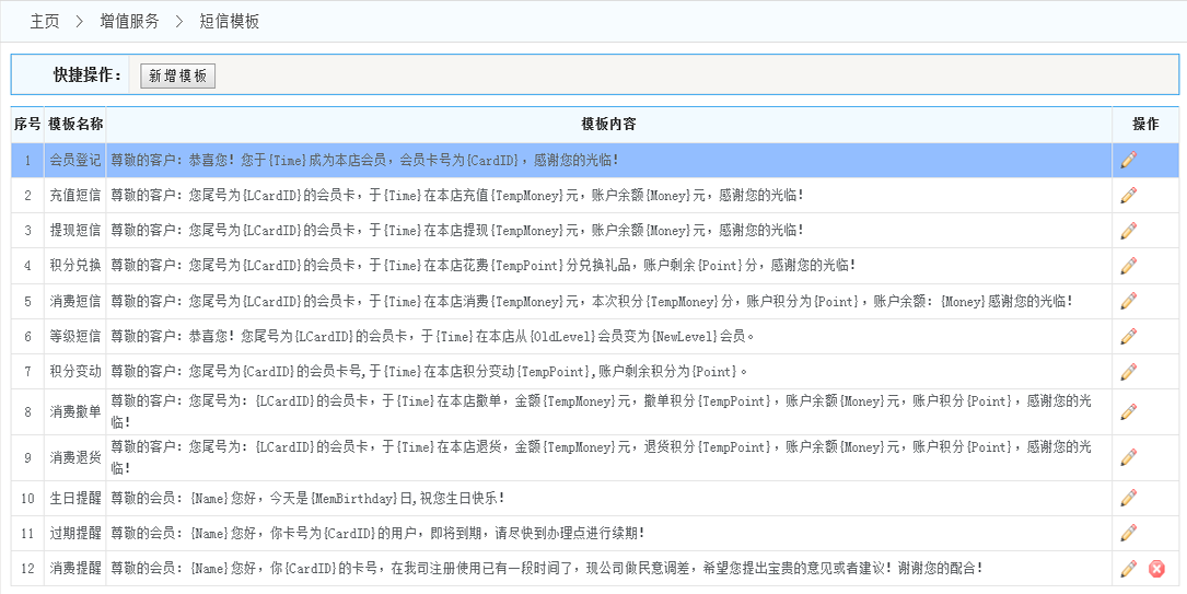 系統(tǒng)模版: 一到十一為系統(tǒng)內(nèi)置模板只可以修改不可以刪除(包含積分變動(dòng)、等級(jí)短信、消費(fèi)短信、積分兌換、提現(xiàn)短信、充值短信、會(huì)員登記;)十二以后為用戶自定義短信模板,可編寫,可刪除